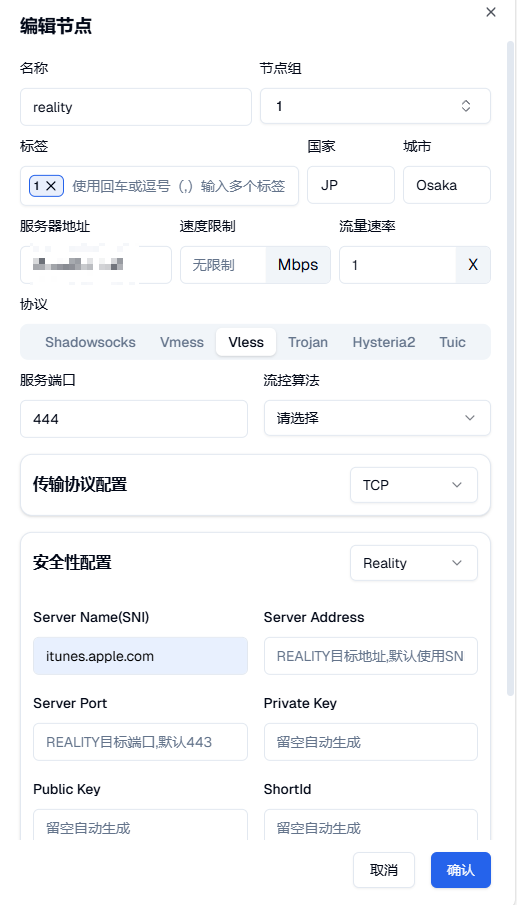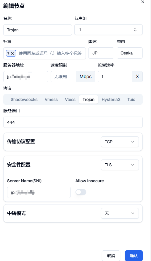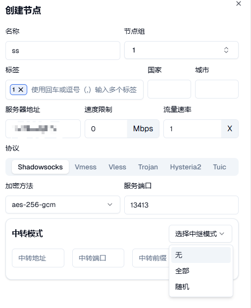 地址填入ip,如果是中转,中转模式选择全部,中转地址填国内入口地址,中转端口填国内入口端口,前缀为中转名字,可不填无影响