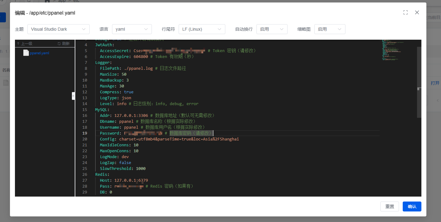 创建必须的配置文件:首先手动创建并配置 /app/etc/ppanel.yaml 文件,以便进行后续配置。