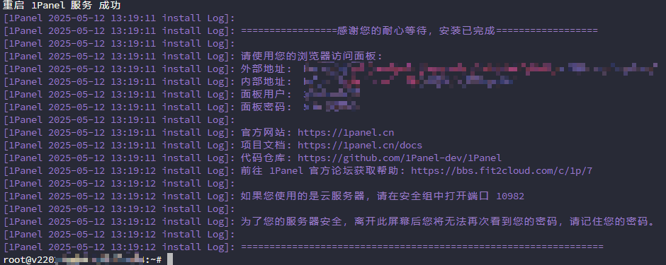 bash <(curl -sSL https://linuxmirrors.cn/docker.sh)安装成功后,控制台会打印面板访问信息,可通过浏览器访问 1Panel: