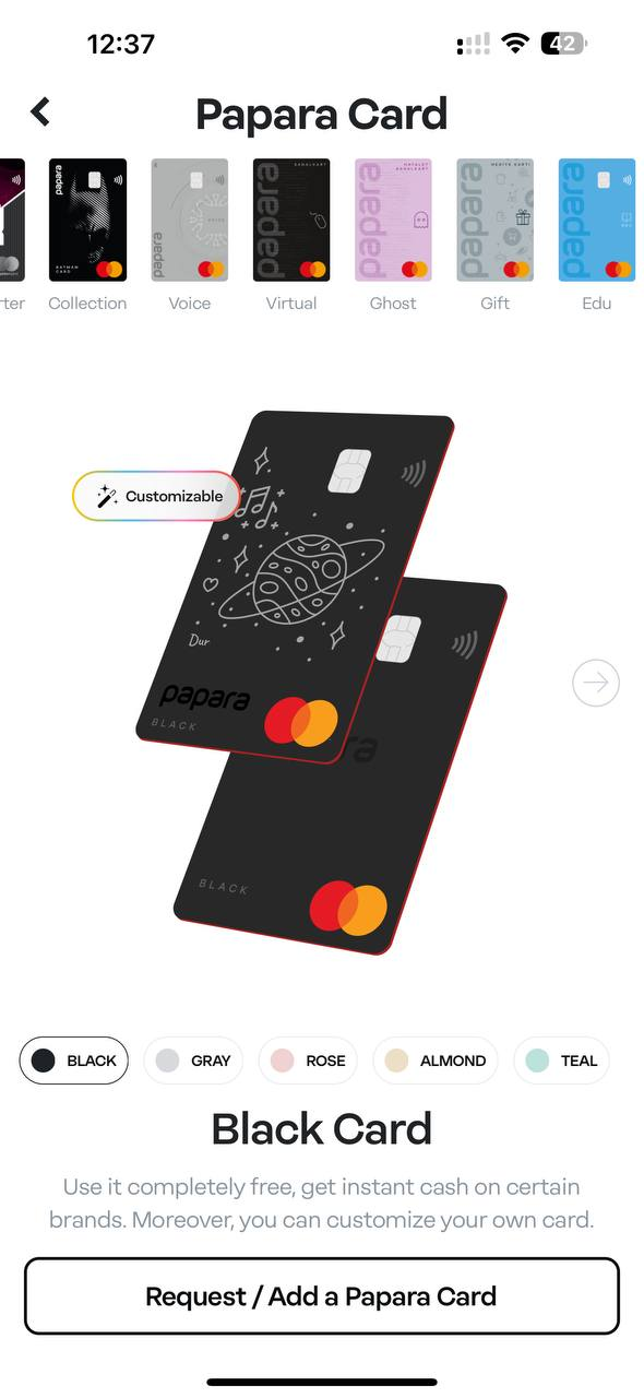 对于我们使用一般只会用到Virtual(虚拟卡)、Ghost(一次性卡)这两种,另外papara每个月提供十次开卡机会,前两次免费,后面收取1里拉的开卡费,虚拟卡设置好限额和名字(可选)后开卡即可使用,papara卡头相较于之前的ozan更干净,spotify这类订阅更容易开通。